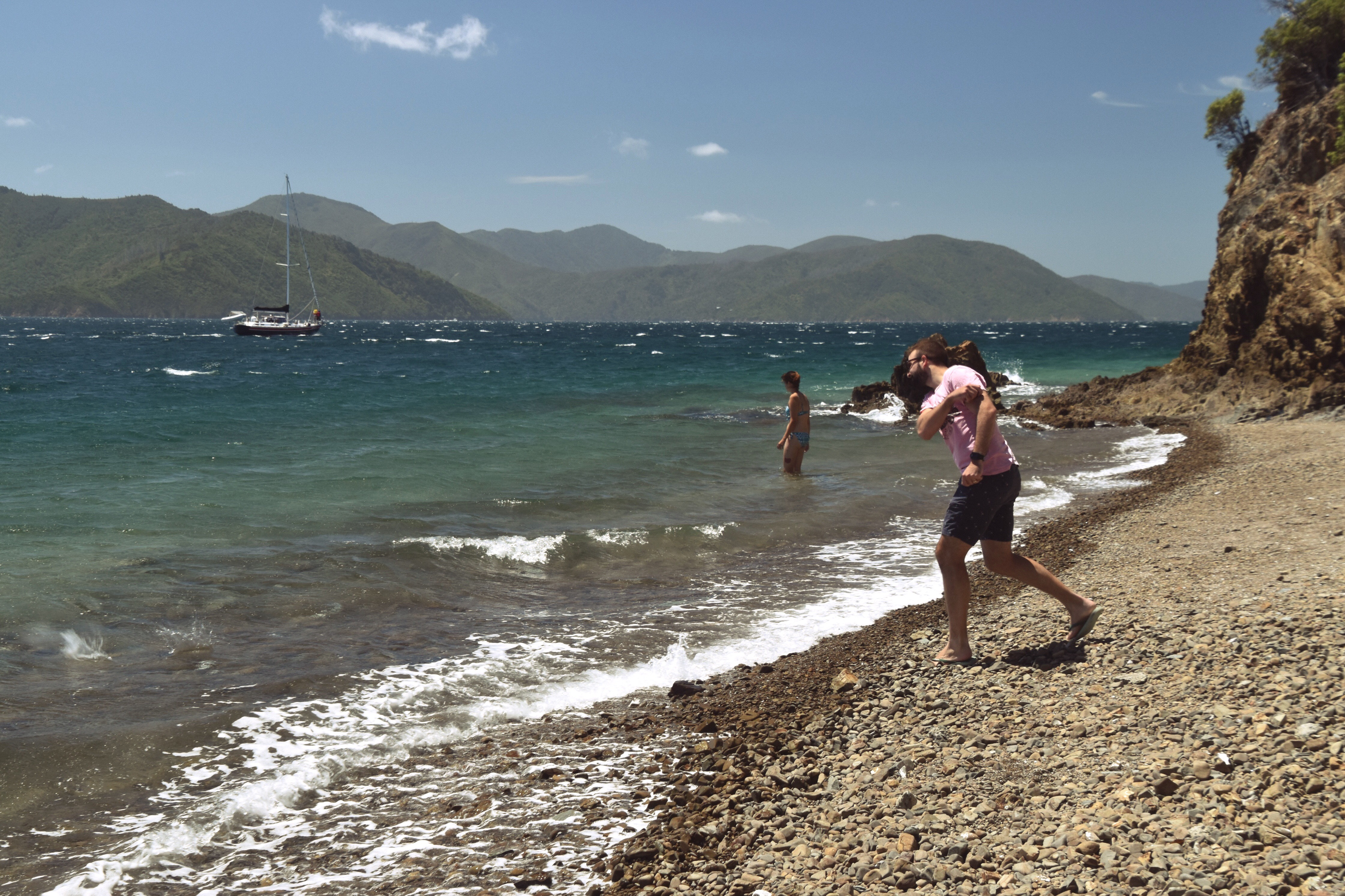 We find a beach thats pretty perfect for skimming stones, spend a few minutes there before moving on…
